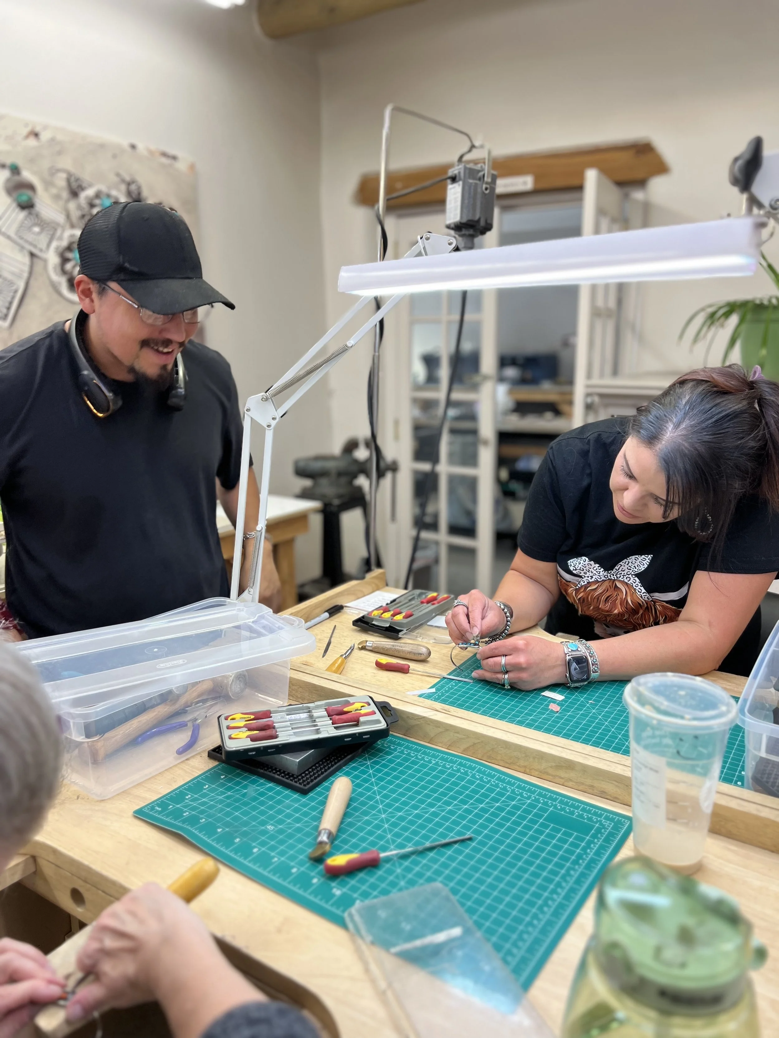 Our Adobe Sky Cuff Bracelet workshop was filled with creativity and collaboration. Students shaped silver, set turquoise and coral stones, and designed bold cuffs inspired by the colors and spirit of the Southwest. Each finished piece was unique, reflecting the maker’s vision and story.